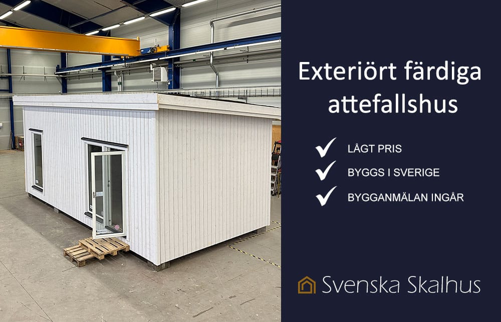 I denna sektion listas leverantörer av skalhus. Attefallshuset levereras som komplett stomme med tak, fönster, dörrar och ytterpanel. Insidan bygger du själv vilket gör det till en kostnadseffektiv lösning.