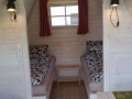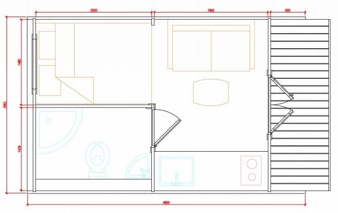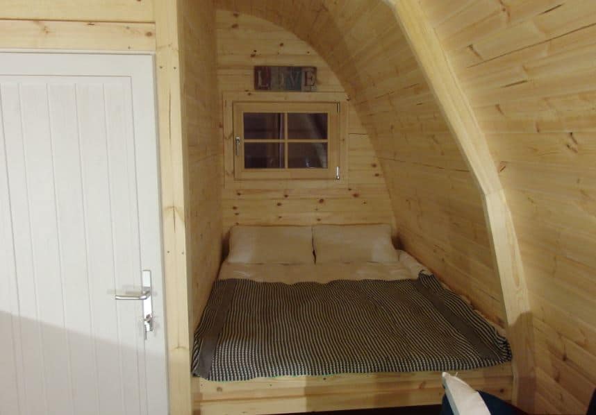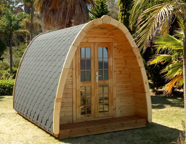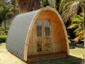 Denna Pod är 4,8 meter lång och 3 meter bred. Väggarna är 46mm tjocka och taket täcks med bitumen asfalt. Du kan välja på svarta, röda eller grå asfaltsplattor. Fönster på ena kortsidan och glasdörr med spröjs på den andra. Framför dörren en liten altan av 28mm tjocka tryckimpregnerade furuplankor.