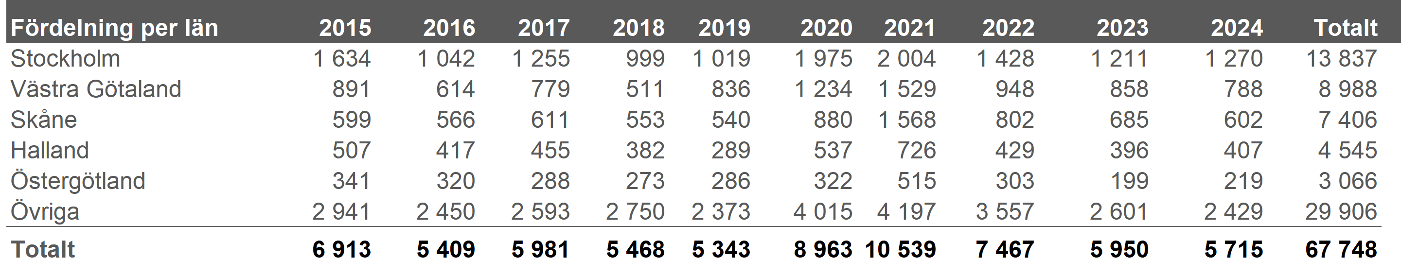 För 2024 var det generellt relativt små förändringar mot 2023. Det som sticker ut är Bleking och Kronoberg som minskade med ca 50%. Störst ökning ser vi i Jämtland som ökar med 40%. Västerbotten som tappade mest 2023 fortsatte att minska, nu med ca 20%, och troligen är detta kopplat till osäkerheten kring Northvolt.