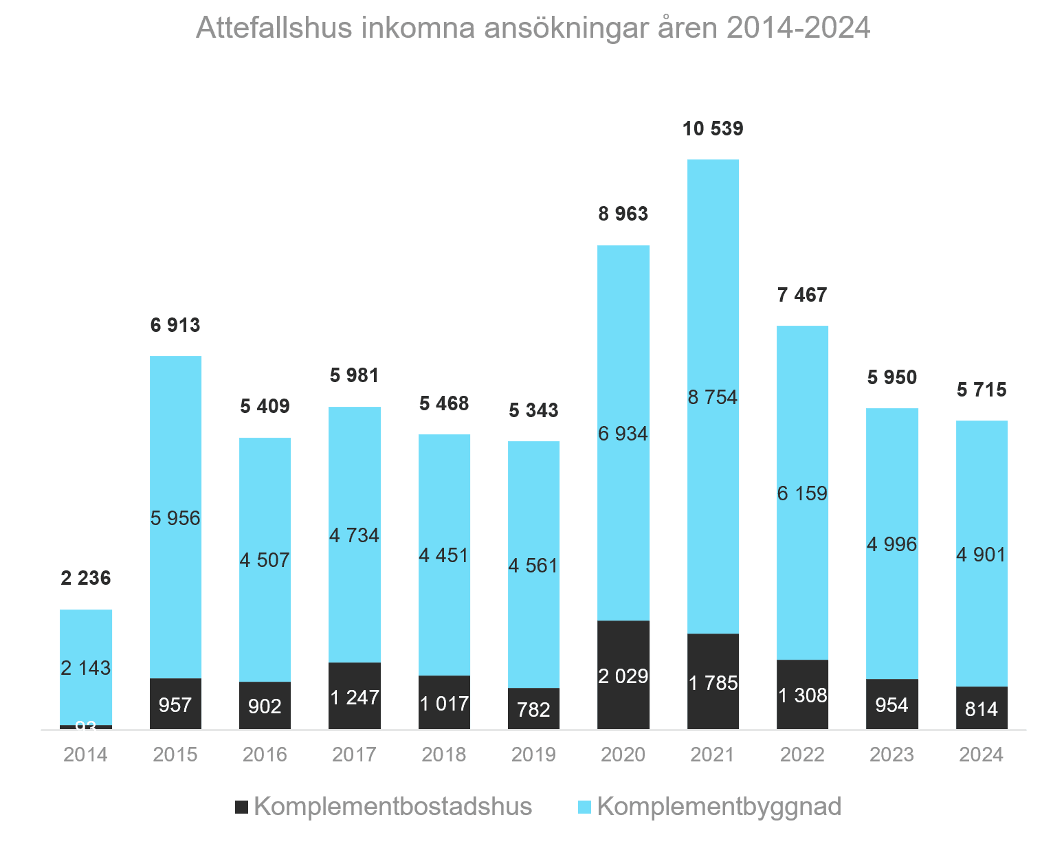 Under åren 2020 och 2021 skedde en kraftig ökning av attefallshus, och under rekordåret 2021 låg det på över 10 000 attefallshus per år. Då var det pandemin med hemmakontor, högkonjunktur och framförallt låga räntor som gynnade efterfrågan på attefallshus. Åren innan 2020 har det varit relativt stabilt runt 5 500 per år.